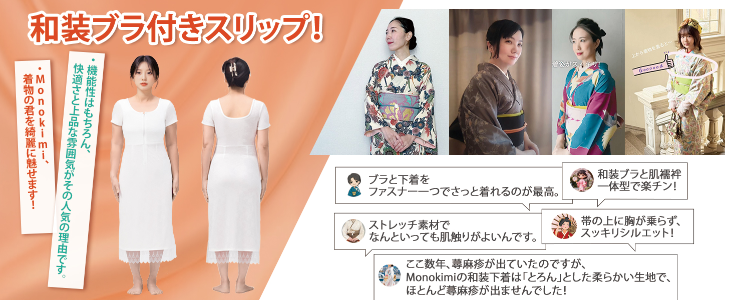 【キレイな「はと胸」&痩せ見え】Monokimi肌襦袢 ワンピースは胸を潰せるだけでなく、着脱可能な補正用パットが2枚ついているので、なめらかでキレイな「はと胸」及び痩せ見えを簡単に実現します。大人の可愛い着姿になります。立体裁断補整で、フィットして着姿が格段にアップできます。襟ぐりも深めです。